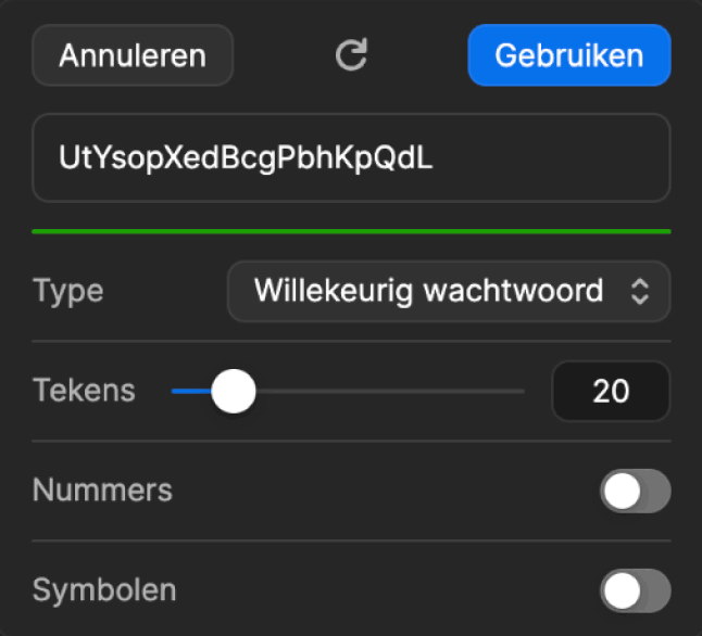 Als je ergens een nieuw account voor aan maakt, dan laat je je password manager een wachtwoord bedenken. De manager geeft je dan een aantal opties of criteria waar je jouw wachtwoord aan kan laten voldoen. Zo kies je gemakkelijk de gradatie van veiligheid voor het wachtwoord.