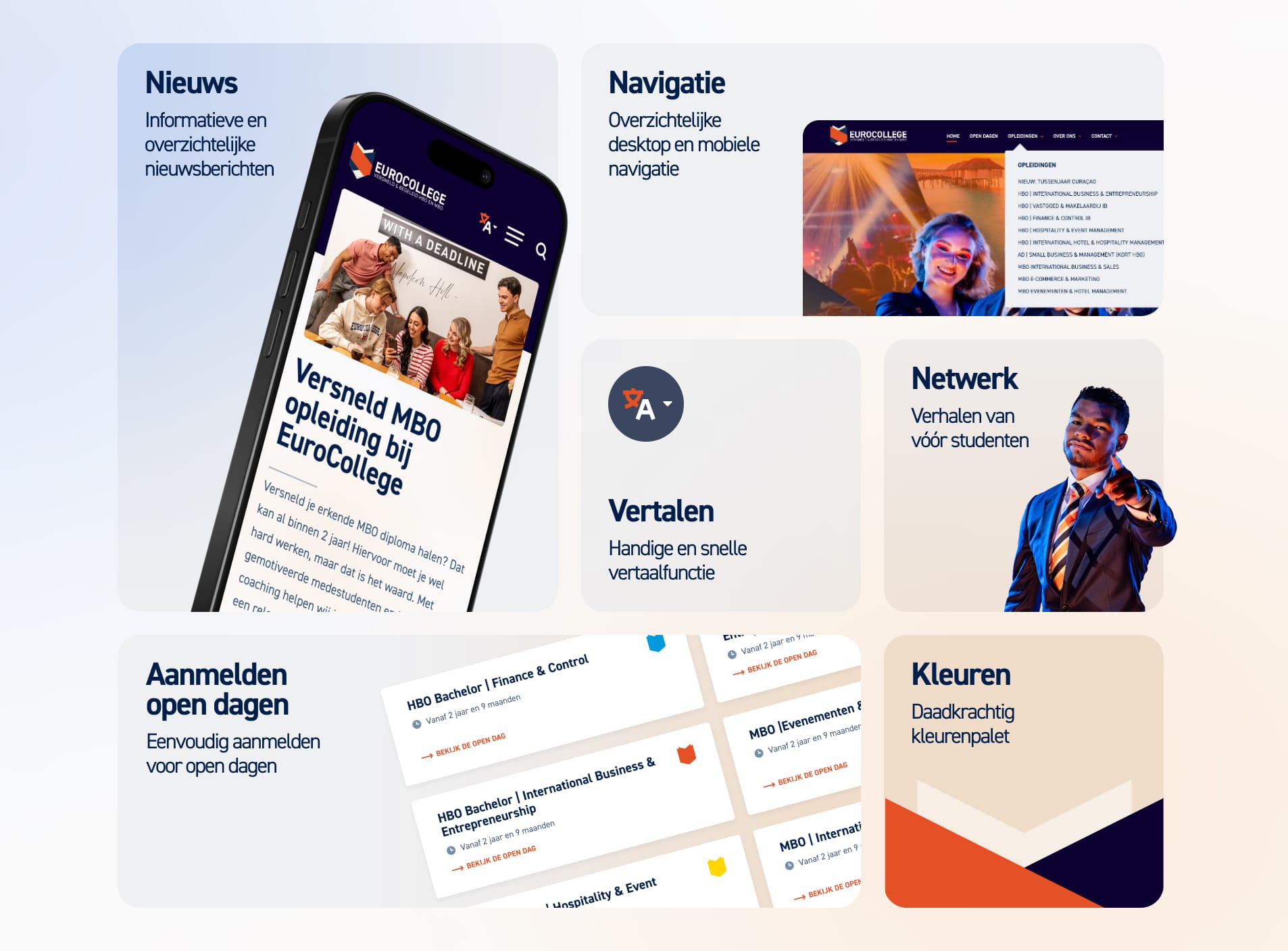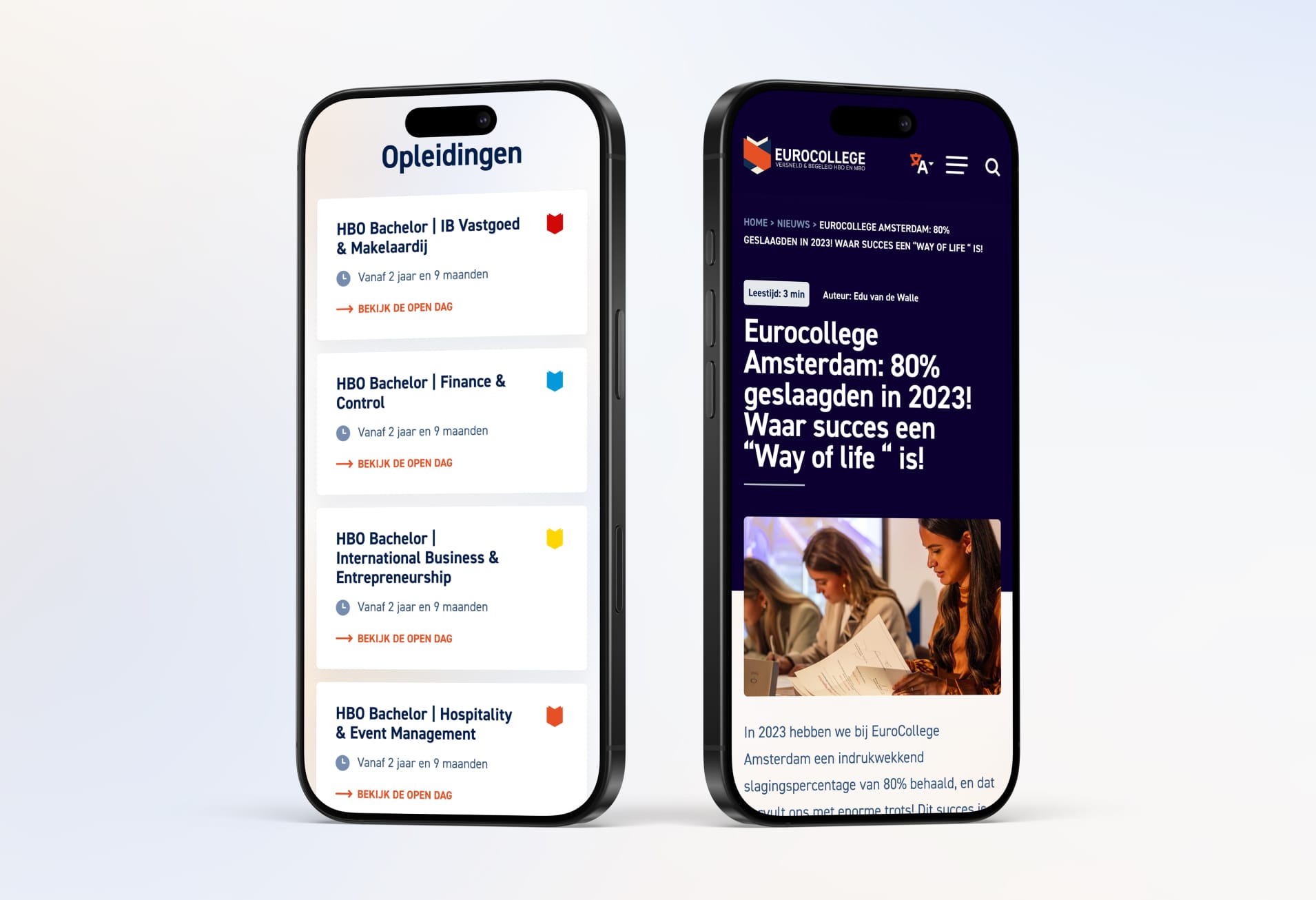 Met een uitvoerig UX onderzoek hebben we alle uitgangswaarden voor de nieuwe website verzameld. De nieuwe website neemt de gebruiker echt bij hand. Geïnteresseerden downloaden eerst een brochure, daarna bezoeken studenten graag eerst een open dag en daarna eventueel een intakegesprek. Geheel drempelloos en qua afwikkeling aangesloten op de backoffice van EuroCollege.